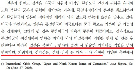 특히 김 전 차관은 일본의 입장에 대해 "북한의 급변사태 발생 시 단순한 기지제공 역할을 넘어 병참지원, 기뢰제거, 선박검문, 경계·감시 등 대북 군사 작전에 다양한 측면에서 실질적 도움을 줌으로써 통일 한반도 질서 창출에 주요 구성원으로 참여하려고 할 가능성이 크다"라며 "미국 또한 이를 적극 활용하려고 할 것"이라고 했다. 대량의 탈북민이 해상 난민(boat people)으로 전락하거나 북측이 기뢰를 부설해 해상에서 오는 미군 병력을 저지하는 상황 모두를 김 전 차관이 염두에 둔 것으로 보인다.