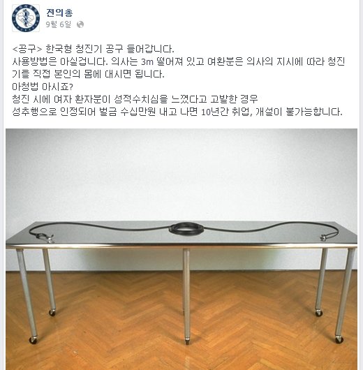 전국의사총연합(전의총)은 얼마 전 공식 페이스북에 다음과 같은 안내와 함께 3미터 길이의 청진기 사진을 올렸다. '한국형 청진기 공구(공동구매) 들어갑니다. 의사는 3m 떨어져 있고, 여환(여자환자)분은 의사 지시에 따라 청진기를 직접 본인의 몸에 대시면 됩니다.' 전의총은 이어 '아청법(아동'청소년의 성보호에 관한 법률) 아시죠? 청진시에 여자환자분이 성적 수치심을 느꼈다고 고발한 경우 성추행으로 인정되어 벌금 수십만원 내고 나면 의사는 10년간 취업, 개설이 불가능합니다'라고 적었다.