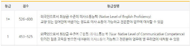 최상위 1+ 등급은 과거 텝스 900점·토익 945점 이상