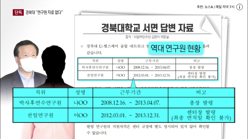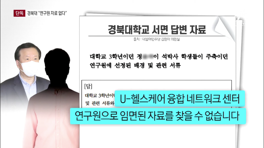 더불어민주당 김원이 의원실에 따르면 경북대는 "정 후보자 아들이 연구원으로 임면, 즉 임명되거나 해임된 자료를 찾을 수 없다"는 입장을 내놨습니다.