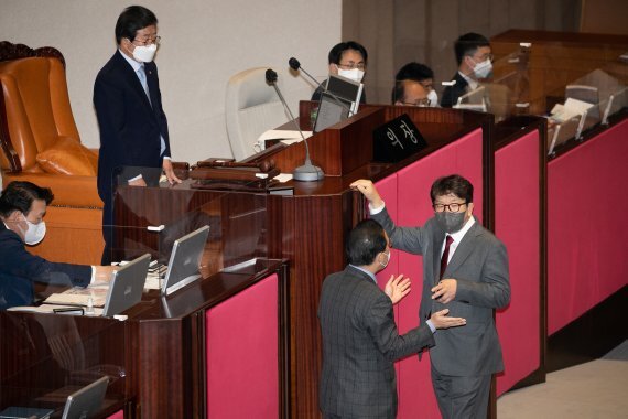 이런 가운데 이날 본회의장에선 법안 처리 과정에서 여야 충돌도 곳곳에서 이어졌다. 박병석 국회의장을 향해 삿대질이 나오는 가 하면 상대 당 의원들을 겨냥해 욕설이 난무한 점에서다.