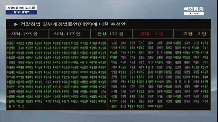 본회의 투표 결과는 재석 177명 가운데 찬성 172명, 반대 3명, 기권 2명이었다. 국민의힘 의원 전원이 표결에 불참한 상황에서 반대·기권 투표한 의원들에 이목이 쏠리고 있다.