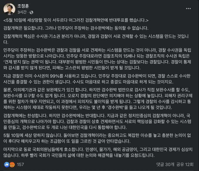 조 의원은 이날 본회의 표결 직후 페이스북에서 “검찰개혁은 필요하다”면서도 “그러나 민주당이 주장하는 검수완박에는 동의할 수 없다”고 밝혔다.