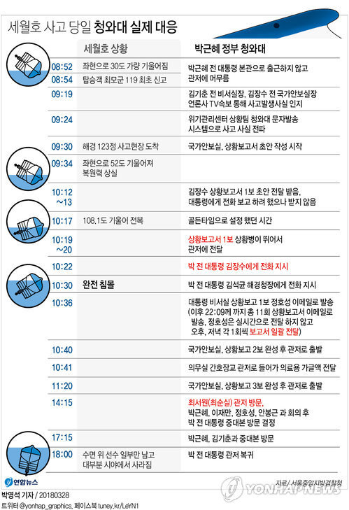 (서울=연합뉴스) 차대운 기자 = 세월호 참사가 발생한 2014년 4월 16일 박근혜 전 대통령이 첫 보고를 받은 시각은 빨라도 전 정부 청와대가 주장한 오전 10시보다 20분가량이 늦은 오전 10시 20분께였던 것으로 검찰이 파악했다. 당시 청와대는 세월호 관련 보고 및 지시 시간을 모두 사후 조작했다고 검찰은 결론 내렸다.