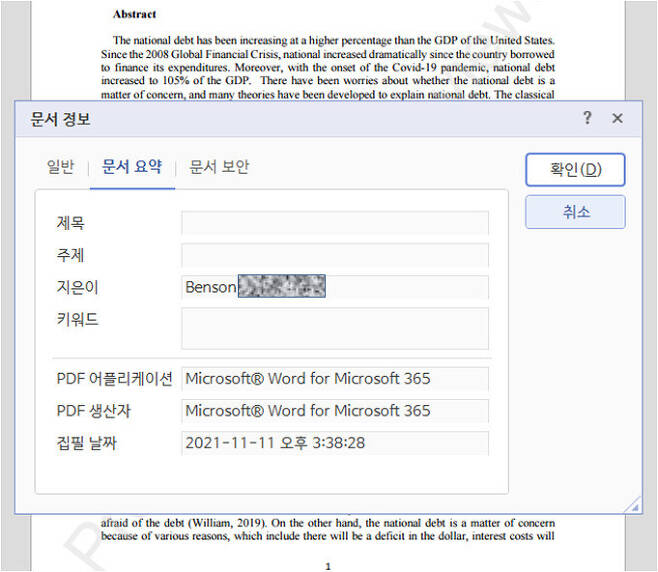 Benson이 보낸 사진에는 ‘National Debt’(국가 부채) ‘National Debt-1_Comment’(국가 부채-1_코멘트)라는 워드 파일이 2021년 11월3일과 4일 작성된 것으로 나와 있다. 한씨의 논문 제목은 ‘국가 부채가 중요한가?’(Does National Debt Matter?)였는데, Benson이 보여준 문서 제목과 핵심 키워드가 일치한다.