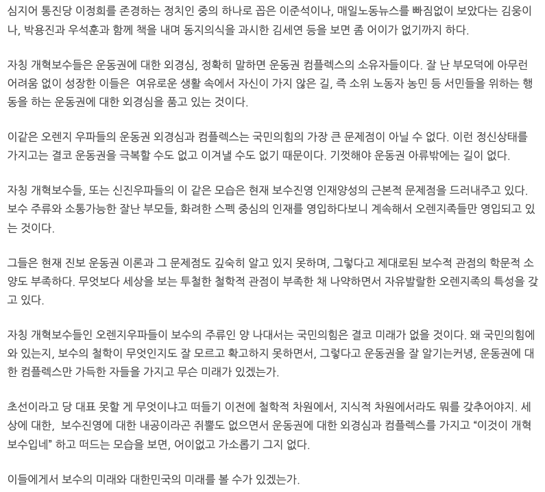 비판 수위도 높았다. 그는 “자칭 개혁보수들인 오렌지 우파들이 보수의 주류인 양 나대서는 국민의힘은 결코 미래가 없을 것”“초선이라고 당 대표 못할 게 무엇이냐고 떠들기 이전에”“내공이라곤 쥐뿔도 없으면서 운동권에 대한 외경심과 콤플렉스를 가지고 ‘개혁보수입네’ 떠드는 모습을 보면, 어이없고 가소롭기 그지 없다”는 등의 표현을 사용했다.