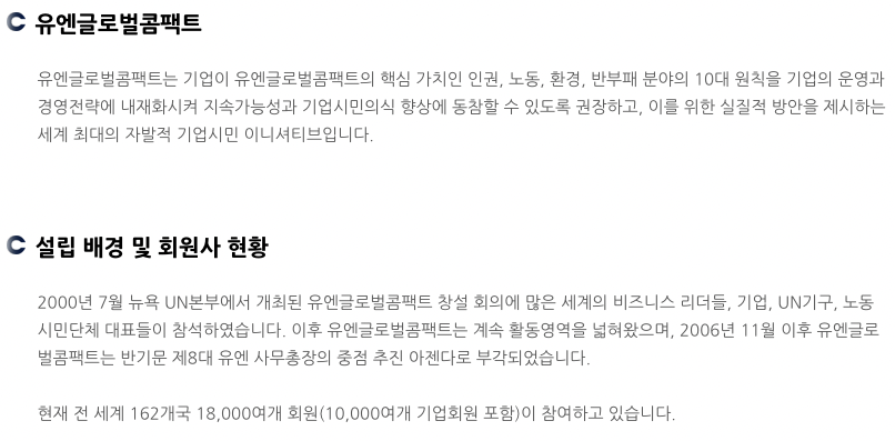 유엔글로벌콤팩트.. 뭔가 했습니다. 약자로 UNGC(United Nations Global Compact).. 전 세계 기업들이 지속 가능하고 사회적 책임을 지는 기업 운영의 정책을 채택하고 그 실행을 국제 기구에 보고 하도록 장려하는 유엔 (United Nations)의 국제 기구로써, 기업체의 사회적 책임에 대한 역할을 관장 하며, 기업 들에게 동기 부여를 하는 국제 사무소라고 합니다..