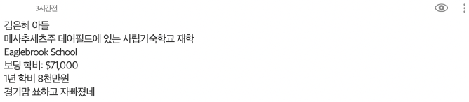 김은혜 후보의 아들은 현재 미 메사추세츠주 데어필드에 있는 사립기숙학교에 다니고 있다. 1922년 세워진 이 학교는 미국 내에서도 상위 보딩스쿨로 알려져 있다. 홈페이지에 따르면 총 250명, 약 20개 나라에서 온 학생들이 한 반에 10명 꼴로 생활하고 있다. 운영 자체가 소수 정예 방식으로 학교 부지는 724에이커(약 89만 평)에 달하며 교내에 아이스링크도 있다.