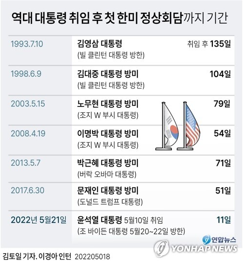 윤석열 대통령은 취임 후 11일 만에 서울에서 바이든 대통령과 마주 앉는데 이는 전례가 없을 만큼 빠르다. 문재인 전 대통령은 취임 후 51일 만에 미국에서 도널드 트럼프 대통령과 첫 정상회담을 가졌고, 박근혜 전 대통령은 취임 71일, 이명박 전 대통령은 취임 54일, 노무현 전 대통령은 취임 79일 만에 미국 대통령과 회담을 가졌다.