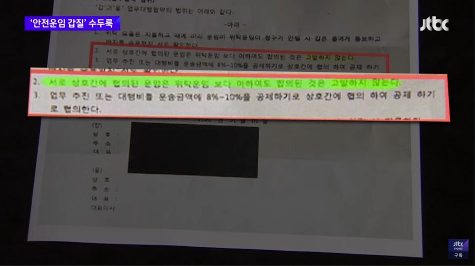 저희 취재진은 화물 노동자들을 만나서 안전운임제의 운영 실태를 직접 들어봤습니다. 갑자기 없던 수수료가 생기거나 운임의 30%만 받는가 하면, 안전 운임을 제대로 주지 않아도 신고하지 않겠다는 협약서를 쓰라고 한 기업도 있었습니다.