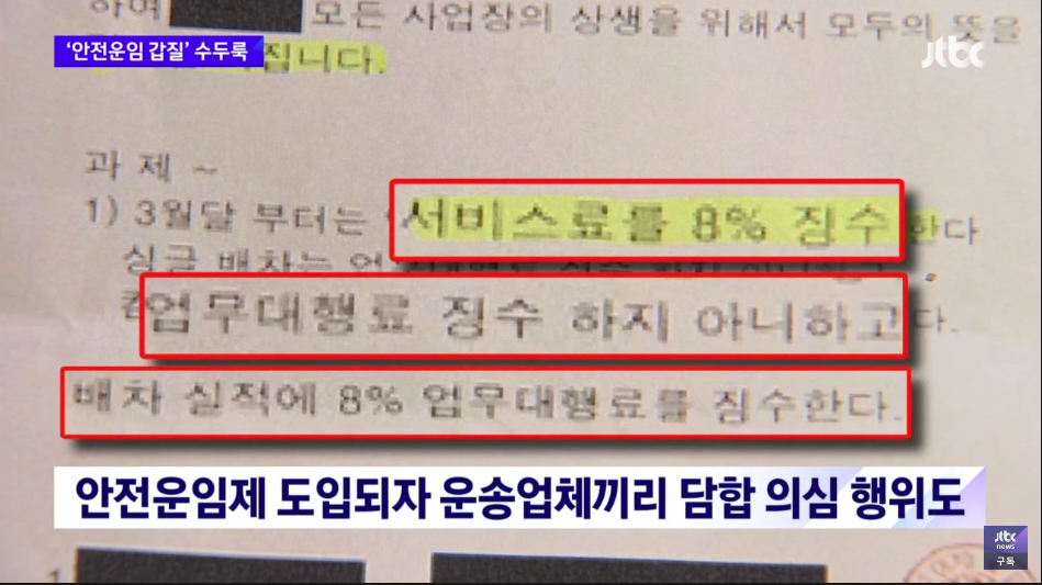 안전운임제로 지출이 늘자 화물차 노동자에게 수수료를 일괄적으로 받자고 약속하는 겁니다.