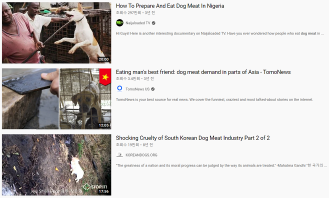 실제로 구글과 유튜브 등에서 검색해보면 세계 각국에서 개가 식용으로 쓰이고 있음을 쉽게 확인할 수 있다.