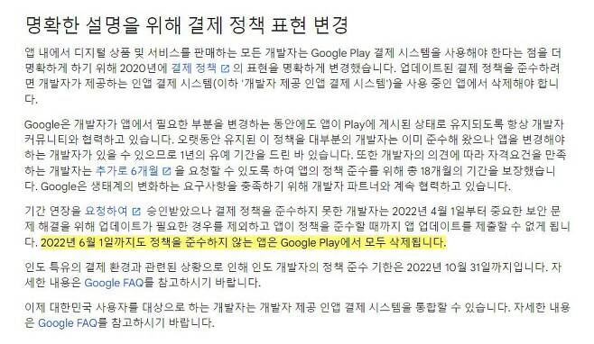 거기다... 인앱에서 다른 결제방식을 안내하는 걸 금지시켰고.. 이를 어기면 구글플레이에서 퇴출시키겠다고 했습니다. 이는 외부결제를 허용하지만 안내를 못하게 만드는... 외부결제가 있으나마나한 구글의 조치입니다. 그래서 구글이 비판을 받아야 할 부분이 이 부분 아닐까 합니다.