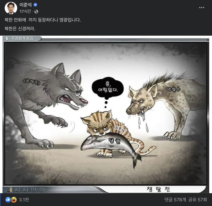 북한의 웹사이트.. 우리민족끼리에서 내놓은 만평인데.. 왜 북한이 한국 정당의 당대표에 대해 관심을 가질까 싶은데.. 아무래도 여당 당대표라서 그런건지.. 북한에 대해 좀 좋지 않은 인식을 가진 정당 대표라서 그런건지..