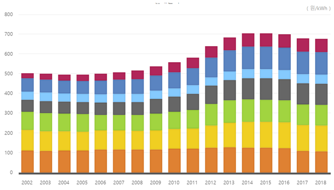한전의 핵심적인 적자 배경은 “유가 상승으로 인한 가스발전과 석탄발전 등의 연료비 상승이 전기요금에 반영되지 않는 전기요금 체계와 원가 상승 요인에도 불구하고 전력 판매단가를 낮춘 결과”로 보는 게 가장 설득력 높다. 한전의 전기 판매단가는 △누진제 구간 완화 △사회적 배려계층 지원 △교육용 전기요금 지원 등 정부의 전기요금 인하 조치로 2016년 킬로와트시당 111원에서 2018년 킬로와트시당 109원으로 2원 하락했다. 2원 하락을 2018년 전체 전력구입량으로 계산하면 약 1조962억 원이다. 사실상 ‘비현실적인’ 전기요금 인하정책이 적자의 원인인 셈이다.