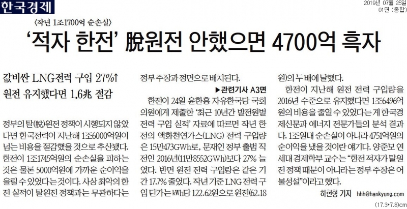 한국경제가 “[단독] ‘적자 한전’ 脫원전 안 했으면 4700억 흑자”(7월24일) 기사에서 “정부의 탈(脫)원전 정책이 시행되지 않았다면 한국전력이 지난해 1조6000억원이 넘는 비용을 절감했을 것으로 추산됐다”고 보도했다.