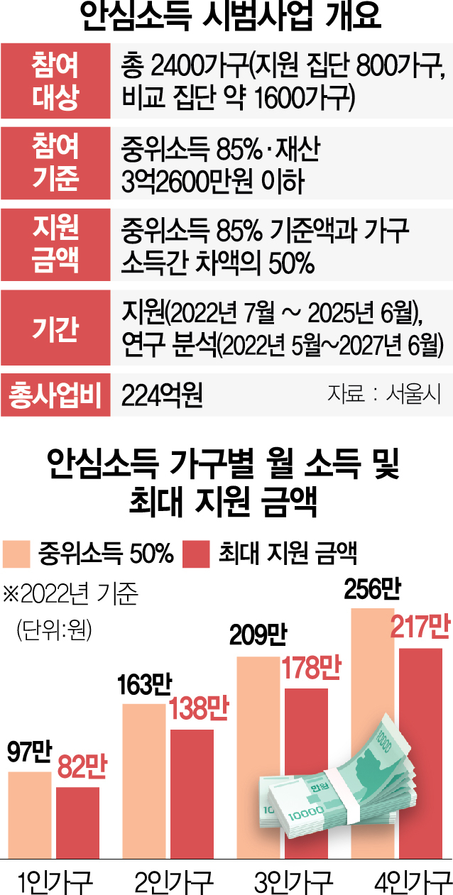 안심소득은 중위소득 85% 이하 가구를 대상으로 중위소득 85% 기준액과 가구 소득 간 차이의 절반을 지급한다. 올해 1인 가구 월 중위소득 50%는 97만 원, 85%는 165만 원이다. 가구 소득이 없는 경우 안심소득 지원 금액은 월 82만 원이며 소득이 늘어날수록 지원 금액은 줄어든다. 지원 기간은 올해 7월부터 2025년 6월까지 3년이다. 시범 사업 참여 가구에 대한 설문 조사를 시작으로 지원 종료 후까지 효과를 다각도로 분석·검증하는 연구 작업은 2027년 6월까지 진행된다.