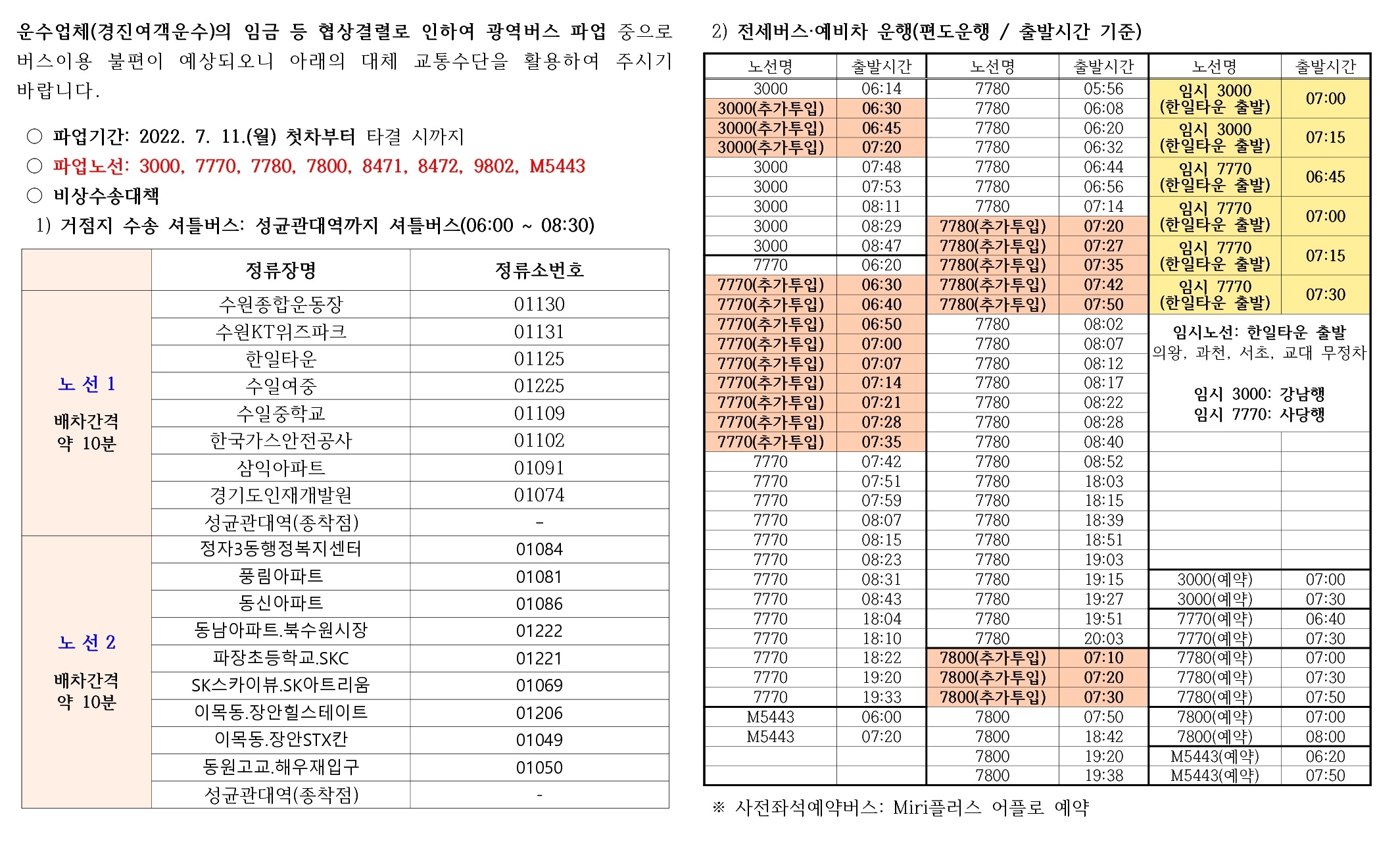 이번 파업으로 운행이 중단되는 공공버스는 수원시 3000-7770-7780-7800-8471-8472-9802번 노선과 화성시 1006-7200-7790-8000-8155-8156번 노선 등 13개 노선이다.