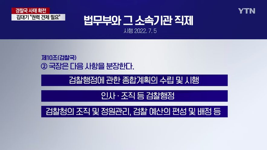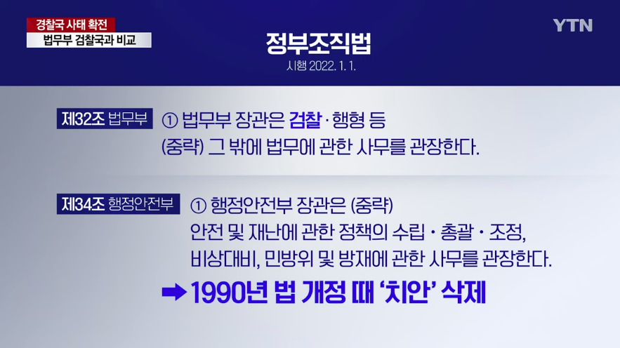 정부조직법에는 법무부 장관의 사무에 '검찰'을 명시하고 있는 반면, 행안부 장관 사무에는 지난 1990년 이후 사라진 '치안'이 존재하지 않는 겁니다.