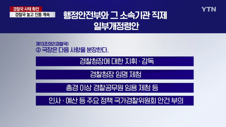 [이웅혁 / 건국대 경찰학과 교수 (YTN 출연) : 치안 관련된 업무가 소관 사무가 아님에도 불구하고 지휘를 부령으로, 시행령으로 하겠다고 한다면 이른바 법치 인사 행정에 반할 수 있는 문제가 있고요.]
