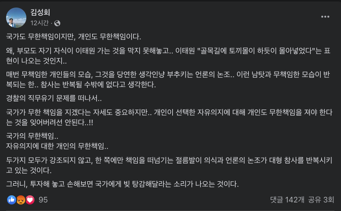 내용을 보면.. 거길 왜갔냐는 내용.... 피해자 탓을 하는 내용이라는 걸 알 수 있죠.. 경찰의 현장관리를 안한 것이 참사로 이어진 것에 대해.. 피해자들이 왜 이태원에 가도록 놔뒀냐는 말... 저런 논리면.. 국가가 관여해서 재난을 막아야 하는 모든 잘못에 대해... 면죄부가 되죠...