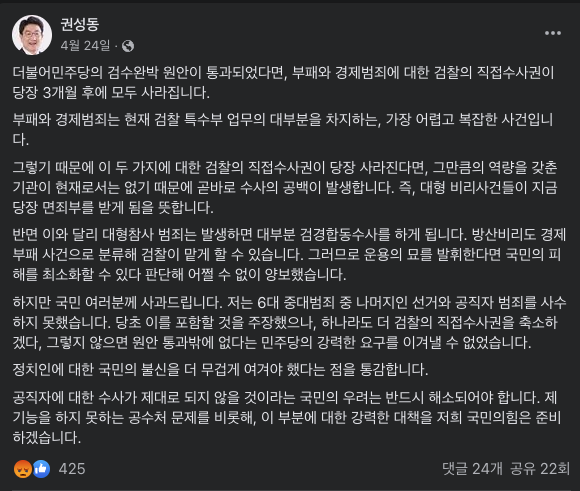 이후 국민의힘과 보수진영에서 논란이 나오고 비난이 나오니.. 관련해서 해명을 한 글에서 그런 생각을 볼 수 있었습니다. 어차피 합동수사등을 하기에.. 운용의 묘를 살리면 직접수사와 다를바 없으니 괜찮을 것이라는 생각 말이죠..