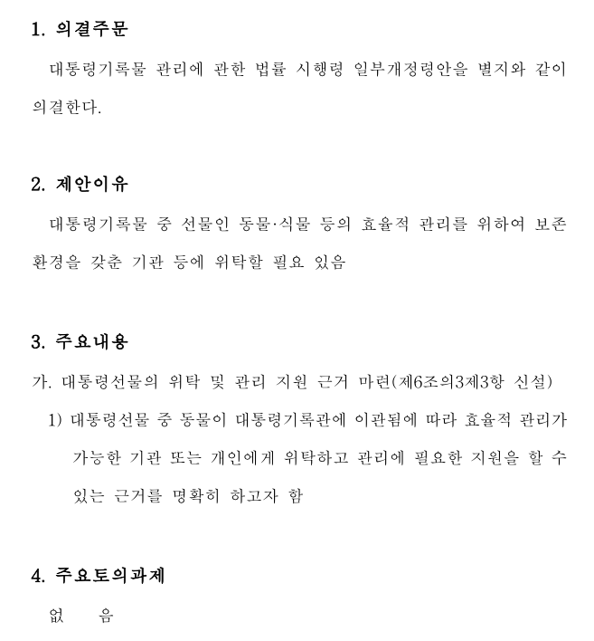 1) 대통령선물 중 동물이 대통령기록관에 이관됨에 따라 효율적 관리가가능한 기관 또는 개인에게 위탁하고 관리에 필요한 지원을 할수있는 근거를 명확히 하고자 함