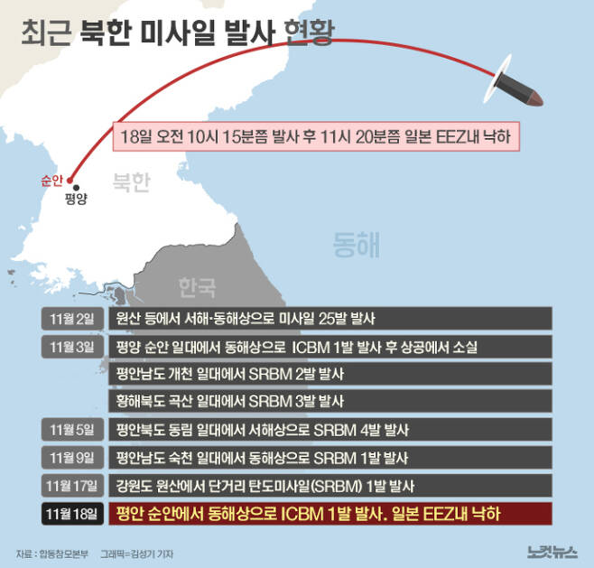 북한은 지난 3일에도 화성 17형을 발사한 바 있다. 이 때는 고도 1920㎞까지 올라가 760㎞를 날아갔는데, 비행 중 정성 속도를 내지 못해 실패한 것으로 분석된 바 있다.