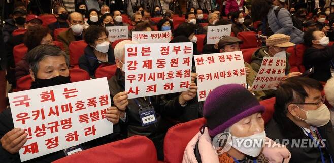 주최 측인 조현동 외교부 1차관과 정진석 한일의원연맹 회장의 개회사에 이어 서민정 외교부 아시아태평양국장과 심규선 강제동원피해자지원재단(이하 재단) 이사장의 발제가 진행될 때까지만 해도 방청석은 '특별법 제정' '사죄하라' 등의 글씨가 적힌 손팻말을 들고 경청하는 등 대체로 차분한 분위기였다.