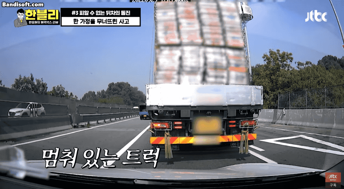 지난 2일 방송 JTBC ‘한블리(한문철의 블랙박스 리뷰)’에는 전방 주시 태만으로 인한 트럭 돌진으로 엄마이자 아내를 잃은 안타까운 가족의 사연이 그려졌다.