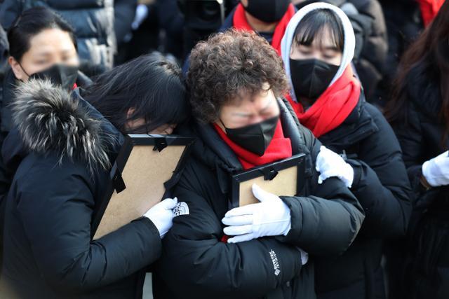 붉은 목도리에 흰 장갑을 쓴 유가족들은 희생자들의 이름이 한명, 한명 호명되고 영정을 건네받자 품에 안으며 눈시울을 붉혔다. 한 유가족은 "어유, 어유"하며 말을 잇지 못한 채 고인의 사진을 쓸어내리며 통곡했다.