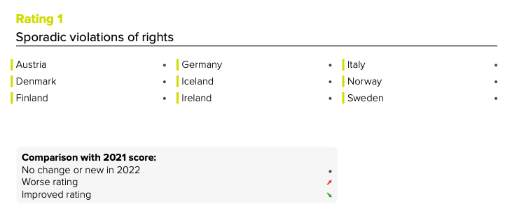 한국은 지금까지 꾸준히 5등급으로서 권리보장이 없는 국가로 분류되어 있습니다.