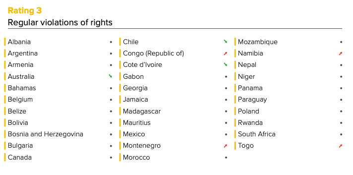 글로벌 노동권지수라고도 합니다. 전세계에 있는 노동자들의 권리가 제대로 지켜지고 있는지에 대해 국제노동조합연맹이 조사를 해서 매해 발표를 합니다.