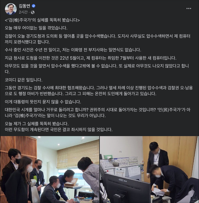 압수수색을 당한 김동연 경기도지사는 페이스북에 글을 올렸네요.