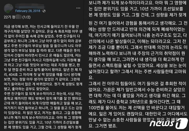 누리꾼들은 정군의 사진과 함께 그가 A학교 재학 시절 작성한 것으로 추정되는 글을 갈무리해 올렸다. 정군이 글을 게재한 곳은 A학교 재학생들이 운영하는 SNS 계정이다.