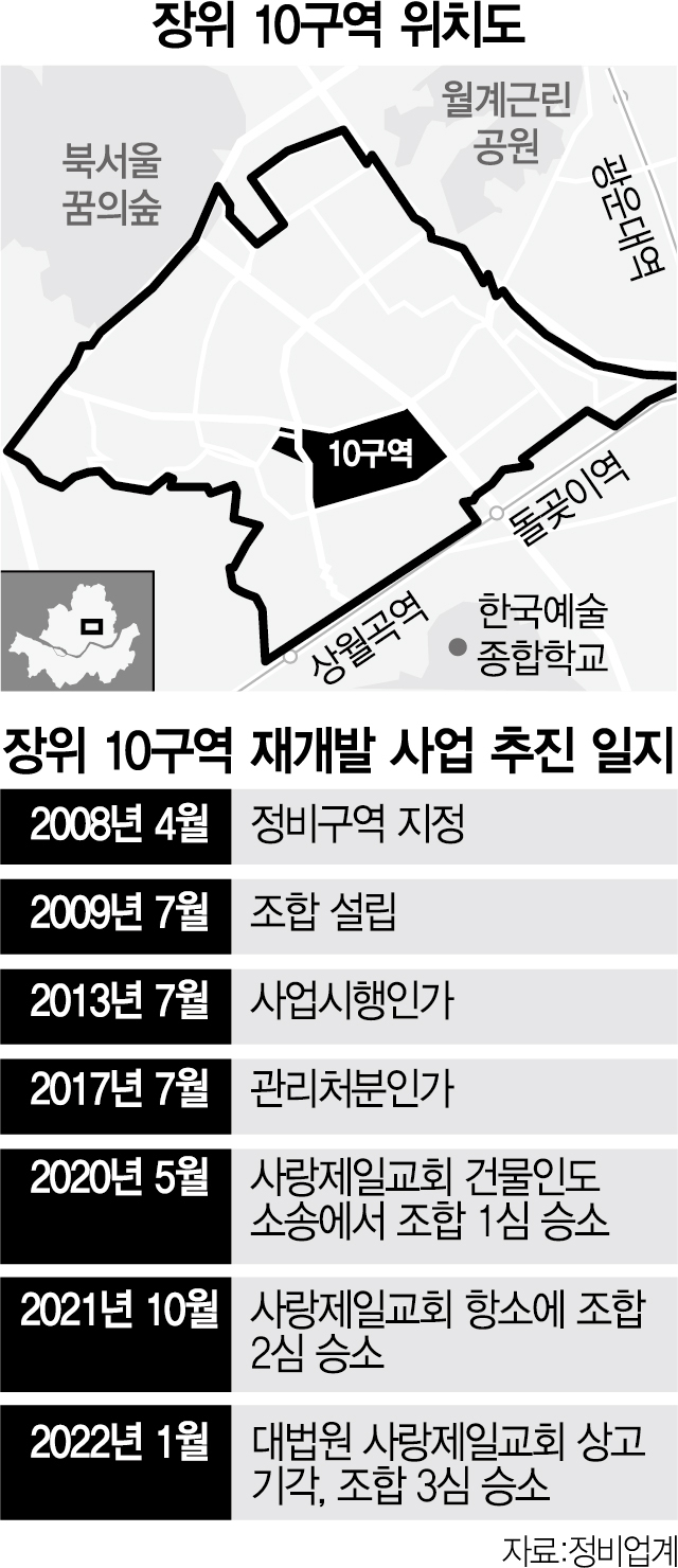 해결 국면에 접어들 것으로 보였던 서울 성북구 장위10구역 조합과 전광훈 목사의 사랑제일교회 간 갈등이 지속되고 있다. 논란 속에 지난해 9월 조합이 철거 보상금 500억원을 지급하기로 하고 양측이 이주 합의문까지 작성했지만, 이후 교회 측이 다시 아파트 두 채를 추가로 요구하면서 버티고 있기 때문이다.