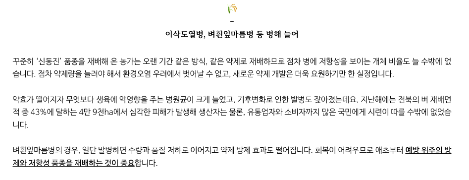 그동안 신동진벼를 계속 수확한 농가는 농사기법이나.. 비료.. 약제등을 거의 비슷한 것으로 계속 써 왔으리라 예상합니다. 이로인해 약제에 내성이 생기는 병해가 발생될 여지가 있습니다. 한가지 품종만 계속 수확한다면 늘 따라오는 문제입니다.