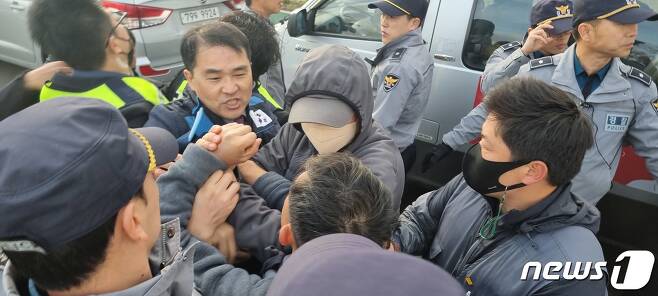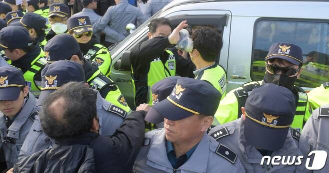 시민사회단체, 서북청년단 탑승차량 둘러싸 하차 봉쇄