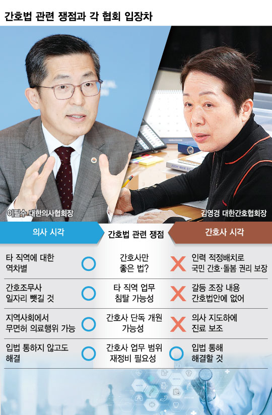 모순되지만 간호법 제정을 추진하려는 간호사, 그리고 이를 저지하려는 의사 포함 13개 보건복지의료연대의 '동일한' 외침이다. '국민 건강'을 담보로 상반된 주장을 견지하며 양측의 선봉에 서있는 대한간호협회와 대한의사협회는 간호법 제정의 마지막 관문을 앞두고 팽팽한 신경전을 이어가고 있다. 이에 본지는 간호법 제정을 둘러싼 핵심 논란에 대해 이필수 대한의사협회장과 김영경 대한간호협회장의 입장을 들었다.