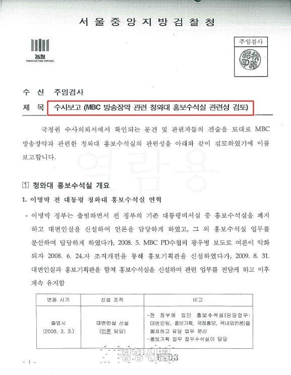 경향신문이 5일 확보한 2017~2018년 국정원 불법사찰 관련 검찰 수사기록·증거기록·진술조서를 살펴보면 서울중앙지검은 2017년 11월5일 ‘MBC 방송장악 관련 청와대 홍보수석실 관련성 검토’라는 제목의 수사보고서를 작성했다.