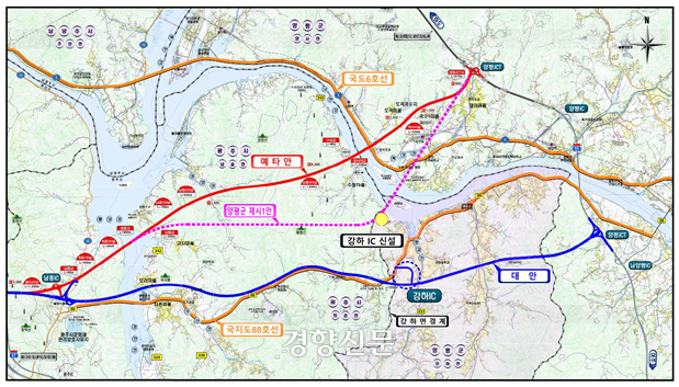 민주당이 2021년 예비타당성 조사(예타)를 통과한 노선(기존안)을 바꿔 강하면을 지나게 하자고 주장한 것은 사실이다. 원래 예타안은 강하면을 지나지 않았다. 다만 민주당은 예타안의 종점을 바꾸지 않고 중간에 살짝 틀어 강하면에 나들목만 내자고 했다. 지난해 7월 양평군이 국토부에 제안한 3개 안 중에 1안에 가까운 안이다. 양평군도 이때는 1안을 ‘경제성과 타당성, 지역주민 편의성을 확보했다’고 가장 높게 평가했다. 민주당은 그런데 갑자기 국토부가 종점을 강상면으로 변경하는 안을 추진했다고 주장한다.