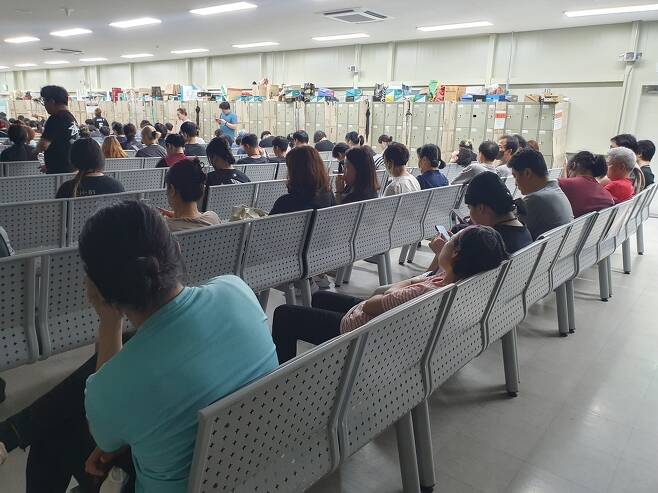 오전 11시30분께 점심시간이 되자마자 터미널 대합실같은 6층 휴게실은 에어컨 바람을 쐬러 온 작업자로 꽉 찼다. 대여섯 명은 의자에 앉지 못해 바닥에 앉았다.