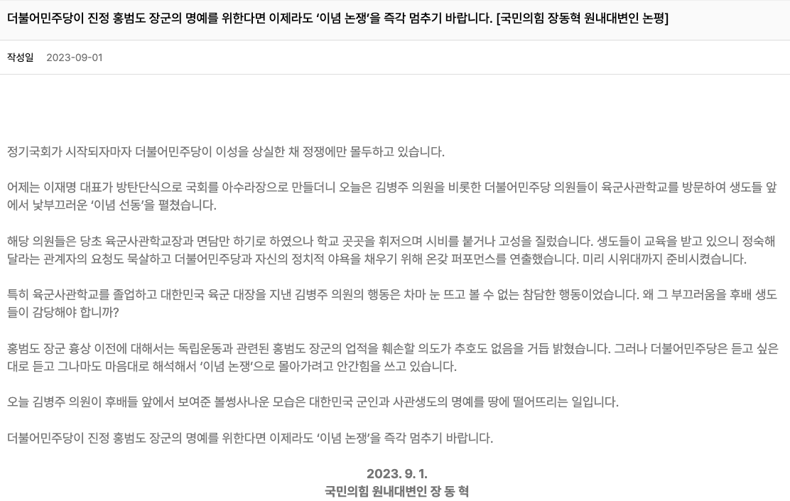 참고링크 : 더불어민주당이 진정 홍범도 장군의 명예를 위한다면 이제라도 ‘이념 논쟁’을 즉각 멈추기 바랍니다. [국민의힘 장동혁 원내대변인 논평]