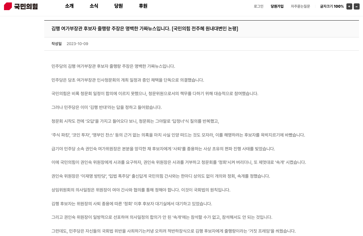 참고링크 : 김행 여가부장관 후보자 줄행랑 주장은 명백한 가짜뉴스입니다. [국민의힘 전주혜 원내대변인 논평]