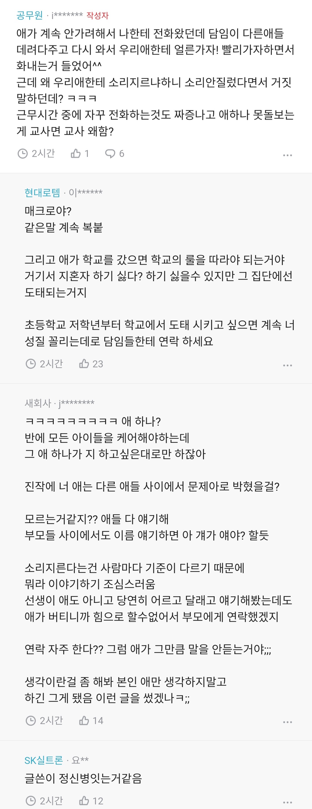 A씨는 "담임이 뭘 잘못한 거냐"는 질문에 "저학년인데 애가 안 가면 물어봐야지 다른 애들 기다린다고 가자고 하는 게 말이 되냐"며 "우리 애한테 소리 지르냐고 하니 소리 안 질렀다면서 거짓말하더라. 근무 중에 자꾸 전화하는 것도 짜증 나고 애 하나 못 돌보는 게 교사면 교사 왜 하냐"고 불쾌해했다.