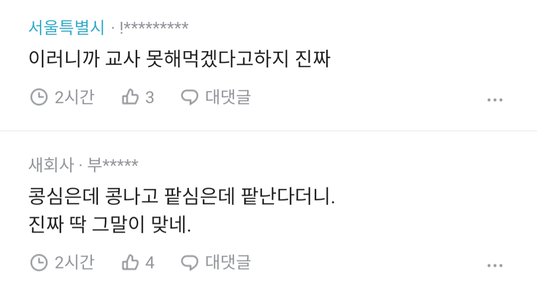 가뜩이나 교권침해 사례에.. 극단적 선택을 한 교사도 있어서.. 교사에게 뭐라 하는 것도 조심스러워해야 할 상황에서.. 블라인드에 글을 올렸다 오히려 역으로 비난만 받은 사례가 나왔었네요..