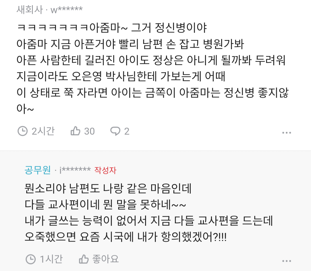 공무원 A씨는 "우리 애가 담임 싫다고 없어졌으면 좋겠다그러고 학교도 안 가고 싶다 그런다. 담임도 우리 아이 안 좋아하고 자꾸 뭐라 하는 것 같은데 별거 아닌 걸로 우리 애 혼내서 연락했더니 우연찮게 담임 아프다고 한동안 안 나온다네? 교권 교권 그러는데 담임한테 뭐라 하지도 못하나?"라고 물었다.