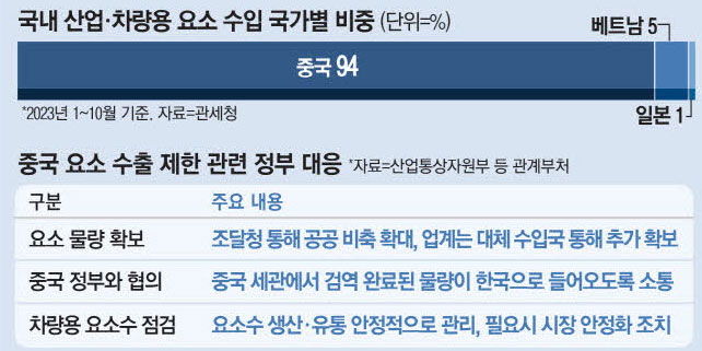 정부도 현황을 추가적으로 파악하고 있다. 최남호 산업통상자원부 대변인은 “중국 통관에서 (요소 수입이) 지연이 된 건 사실”이라면서도 “여러 요소를 통해 확인한 결과 정치적인 결과는 없고 중국 내부적으로 수요가 타이트하는 경제적 요인 때문”이라고 말했다.