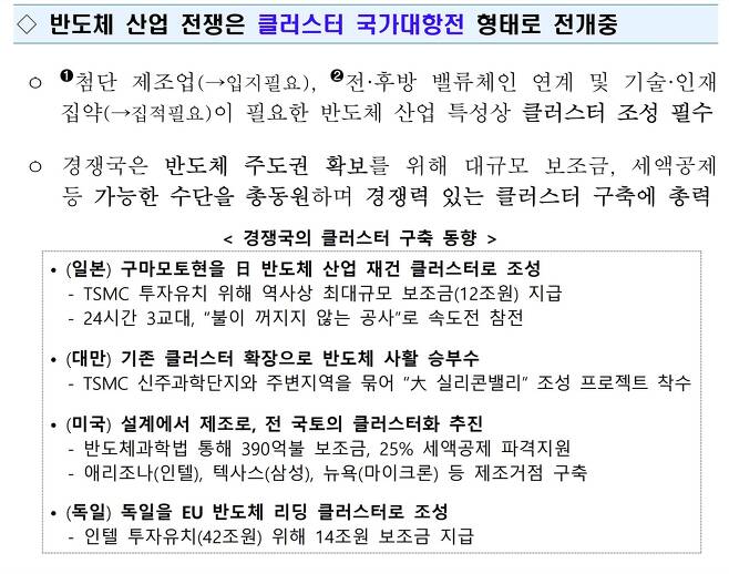 산업부는 보도자료에서 "반도체 산업 전쟁은 클러스터 국가대항전 형태로 전개 중"이라며 우리도 클러스터에 다 끌어모아야 한다고 주장했습니다. 그러면서 일본, 대만, 미국, 독일 등을 사례로 들었습니다. 과연 그들이 반도체 팹과 연관 산업들을 한 군데에 다 몰아넣어서 클러스터를 만들고 있을까요?
