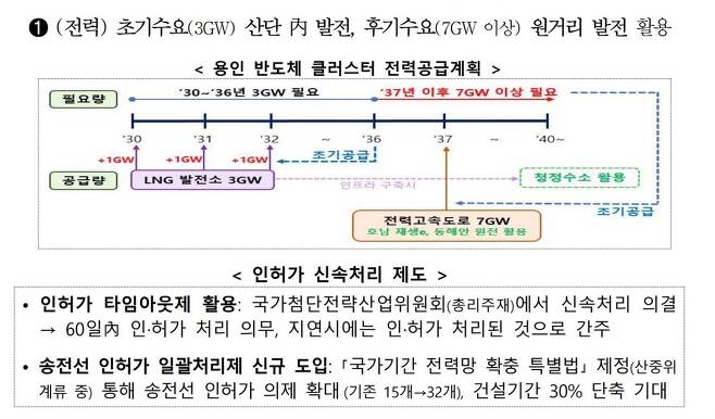반도체 클러스터를 핑계로 원전에 대한 투자를 계속하겠다고 밝힌 것입니다. 산업부의 보도자료에도 "용인 반도체 클러스터 전력공급계획"이 나와 있습니다. 향후 필요한 전력은 10GW인데, 초기수요 3GW는 LNG발전소 6기를 세워 충당하고, 나머지 7GW는 2037년 이후 호남의 재생에너지와 동해안의 원전을 활용하겠다고 되어 있습니다.